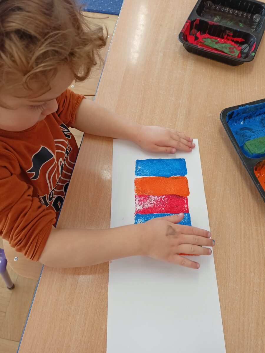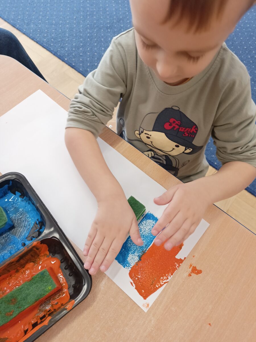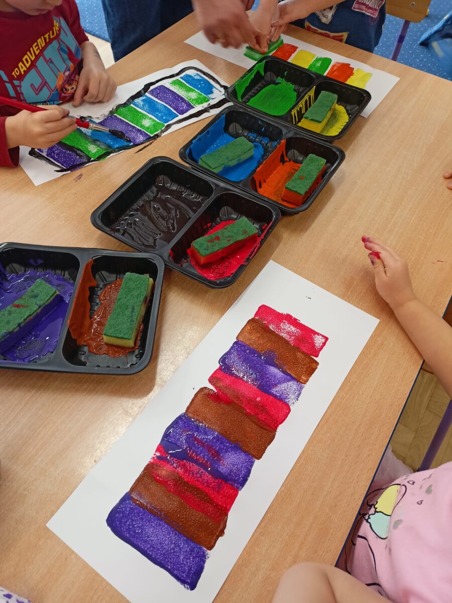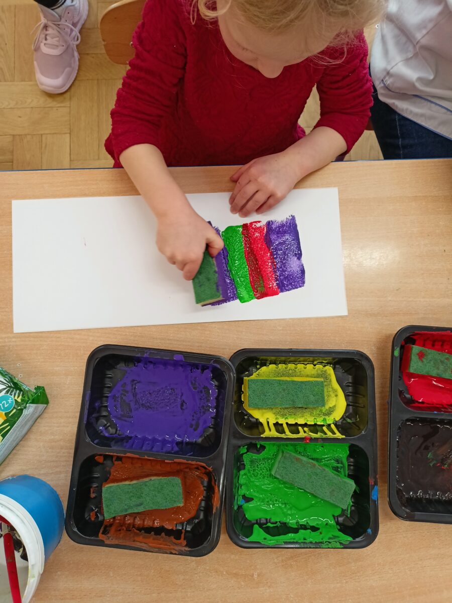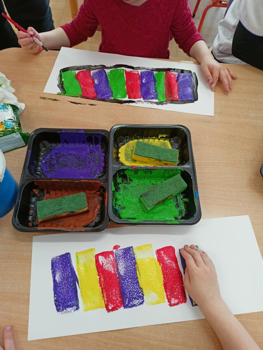 Następnie przedszkolaki wykonały pracę plastyczną polegającą na stemplowaniu kolorów w odpowiedniej kolejności. Dzieci tworzyły własne kompozycje rytmiczne, odbijając farbami przygotowane stemple zgodnie z ustalonym wzorem. Zadanie rozwijało spostrzegawczość, koncentrację oraz sprawność manualną.
