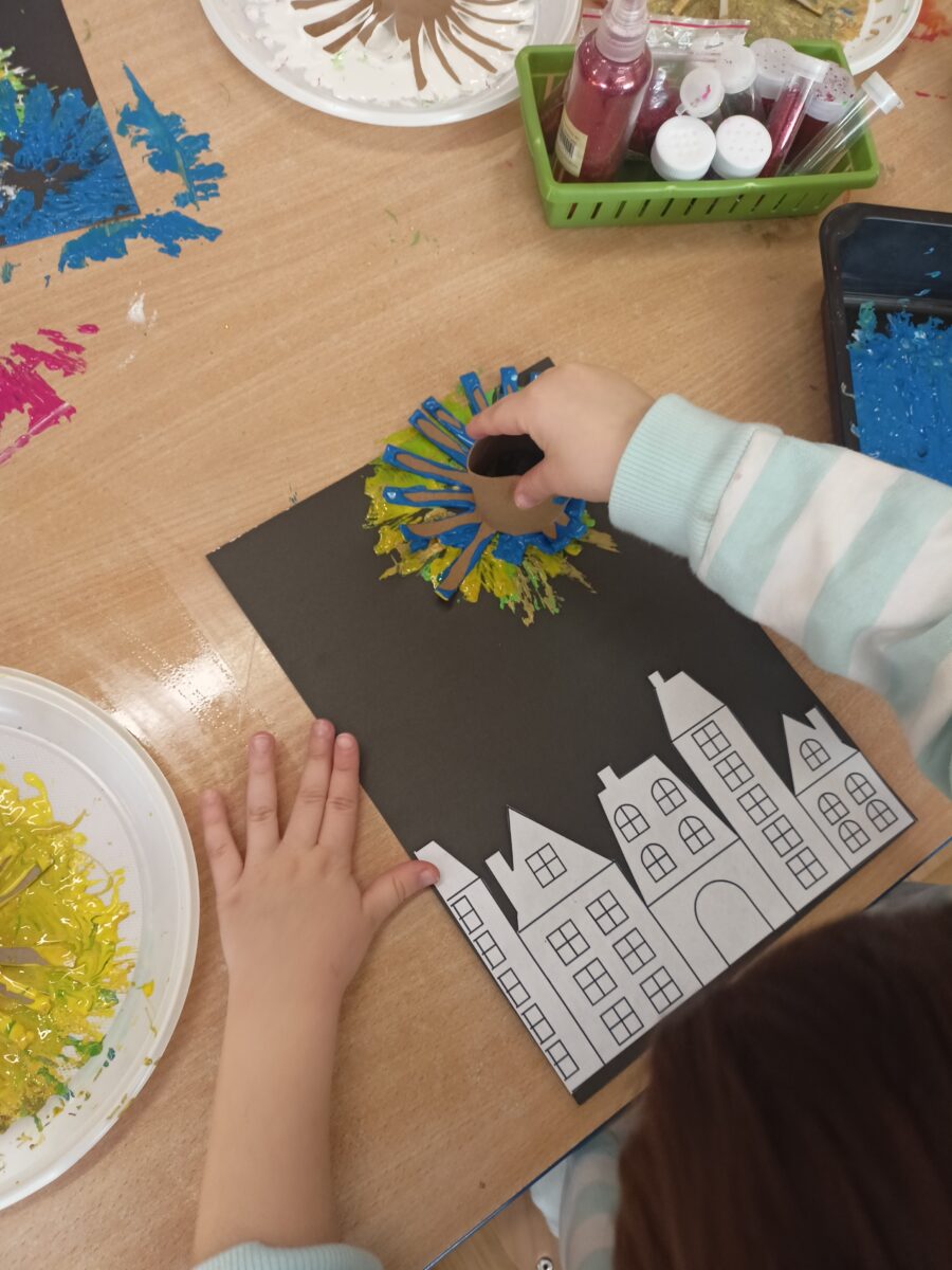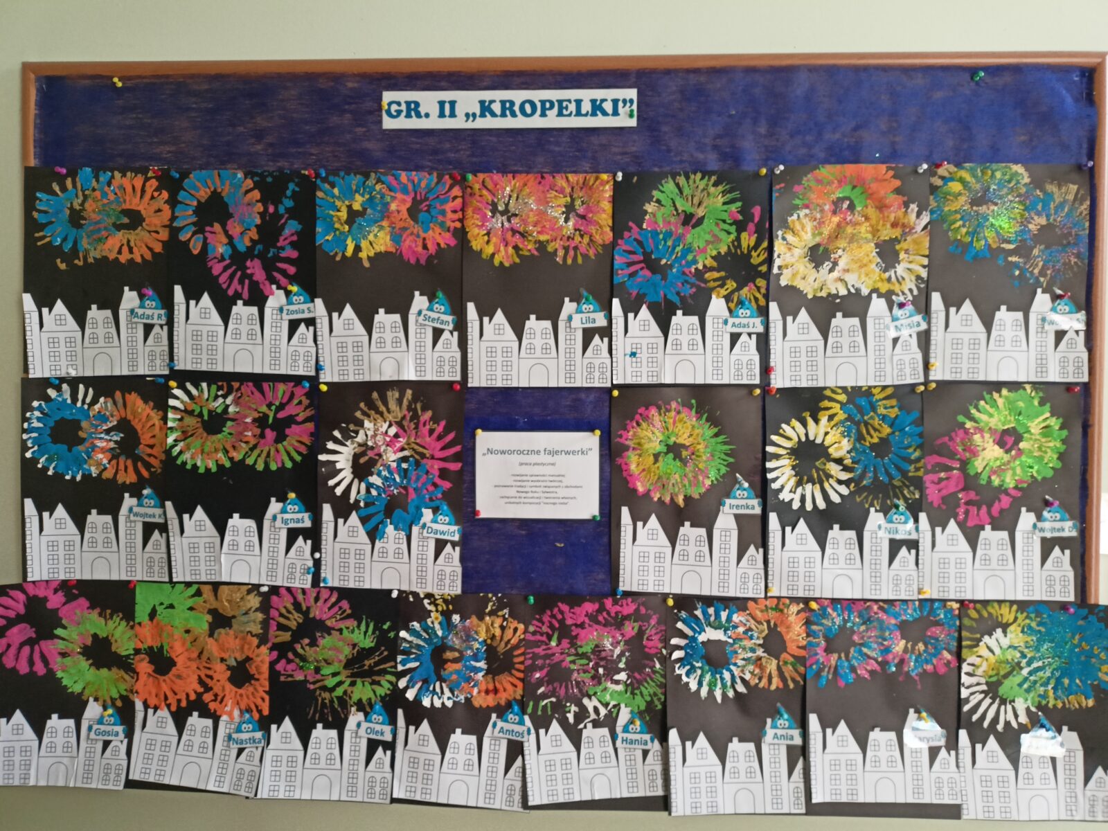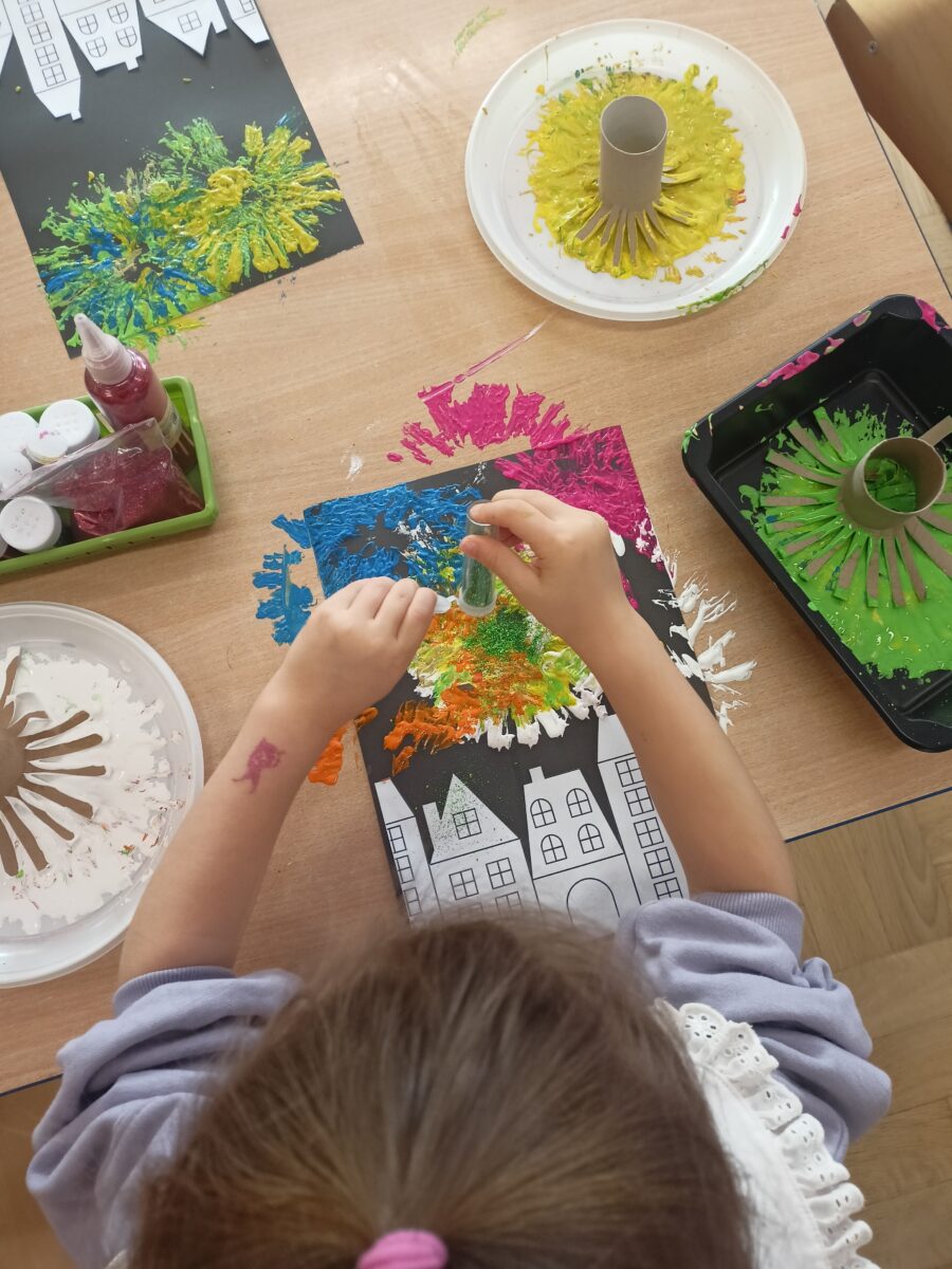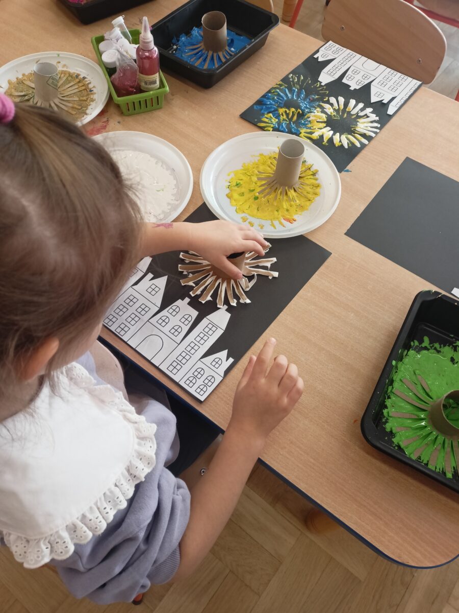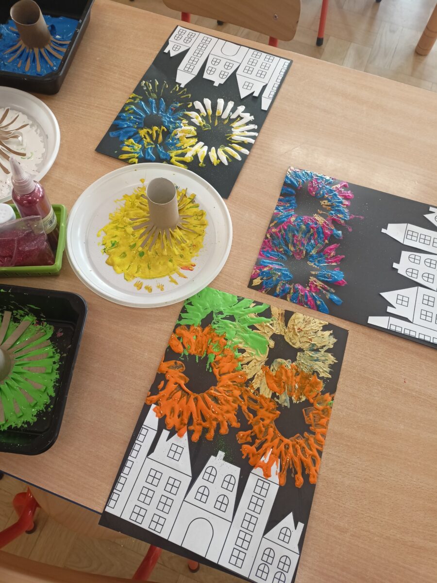 Podczas dzisiejszych zajęć dzieci wykonały pracę plastyczną pt. „Noworoczne fajerwerki”. Na czarnym tle, powstały barwne kompozycje, malowane farbami z wykorzystaniem rolki po papierze toaletowym. Dodatkowo dzieci przykleiły „zimowe” kamieniczki oraz ozdabiały swoje prace kolorowym brokatem, co sprawiło, że nocne niebo pięknie się rozświetliło.