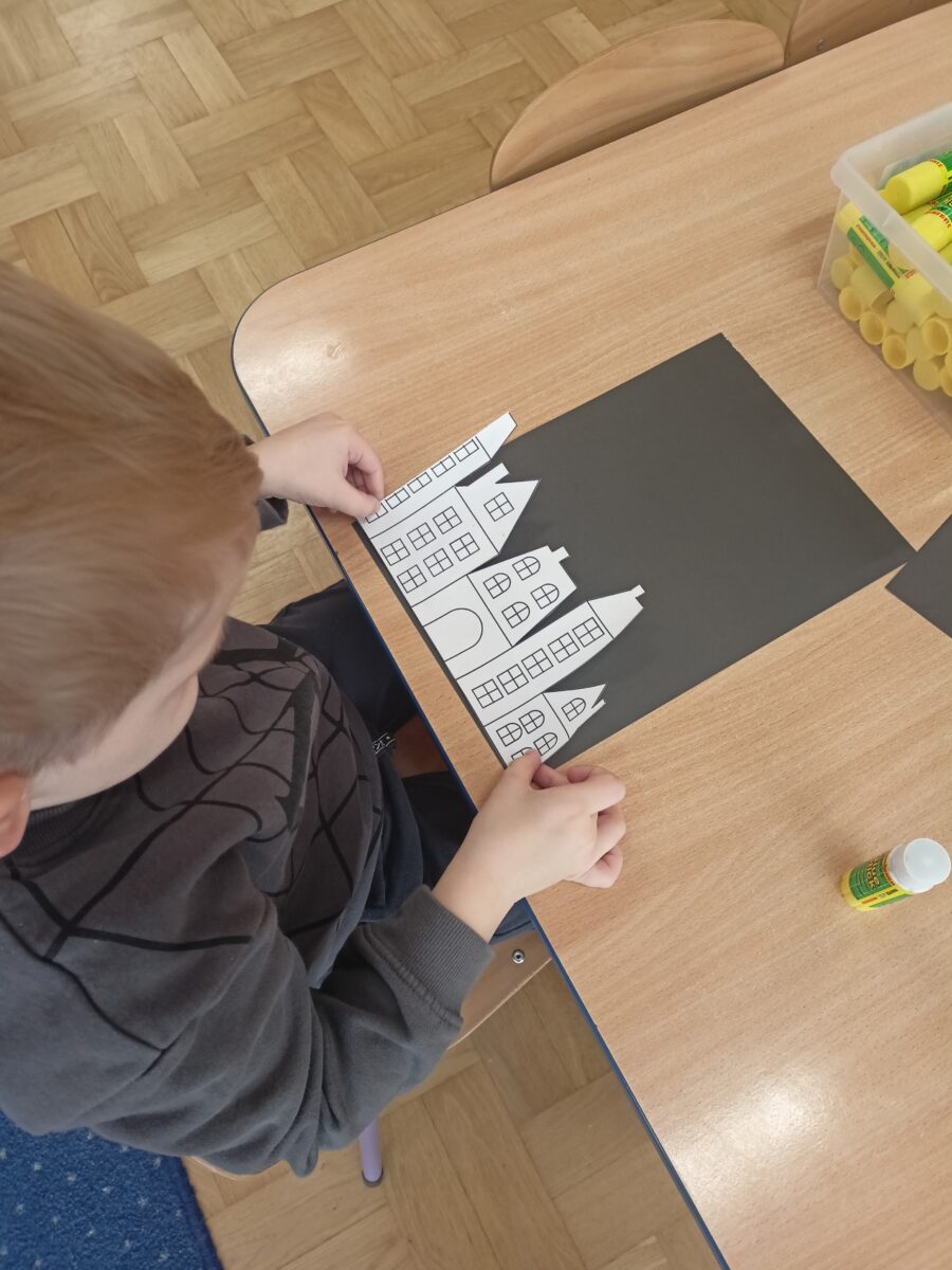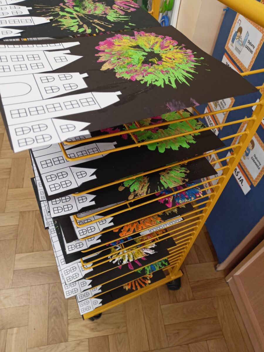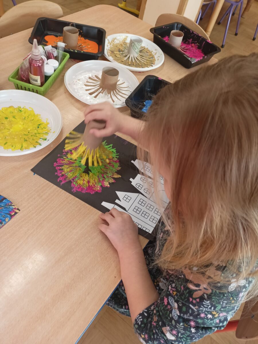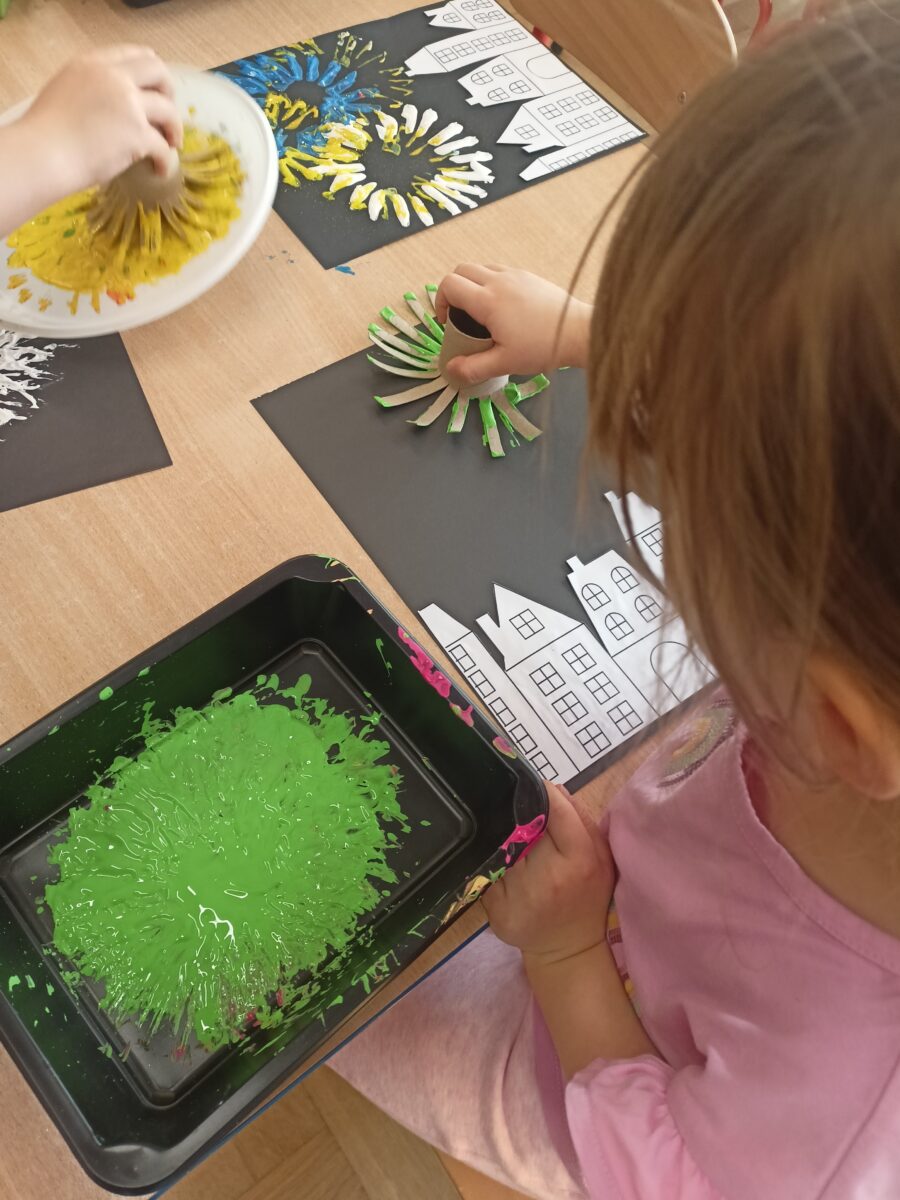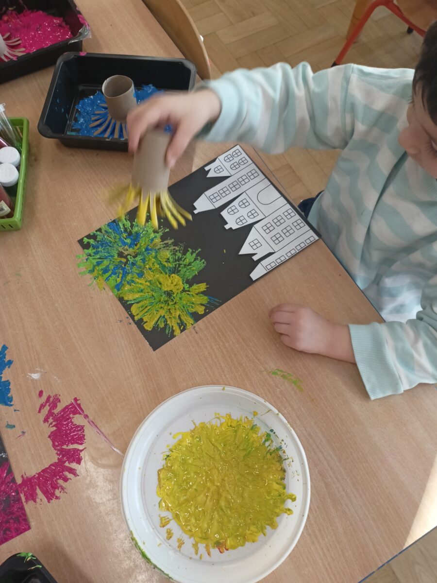 Podczas dzisiejszych zajęć dzieci wykonały pracę plastyczną pt. „Noworoczne fajerwerki”. Na czarnym tle, powstały barwne kompozycje, malowane farbami z wykorzystaniem rolki po papierze toaletowym. Dodatkowo dzieci przykleiły „zimowe” kamieniczki oraz ozdabiały swoje prace kolorowym brokatem, co sprawiło, że nocne niebo pięknie się rozświetliło.