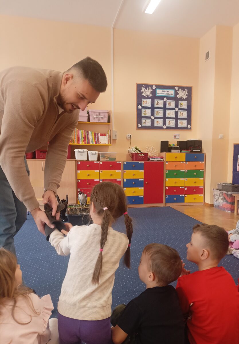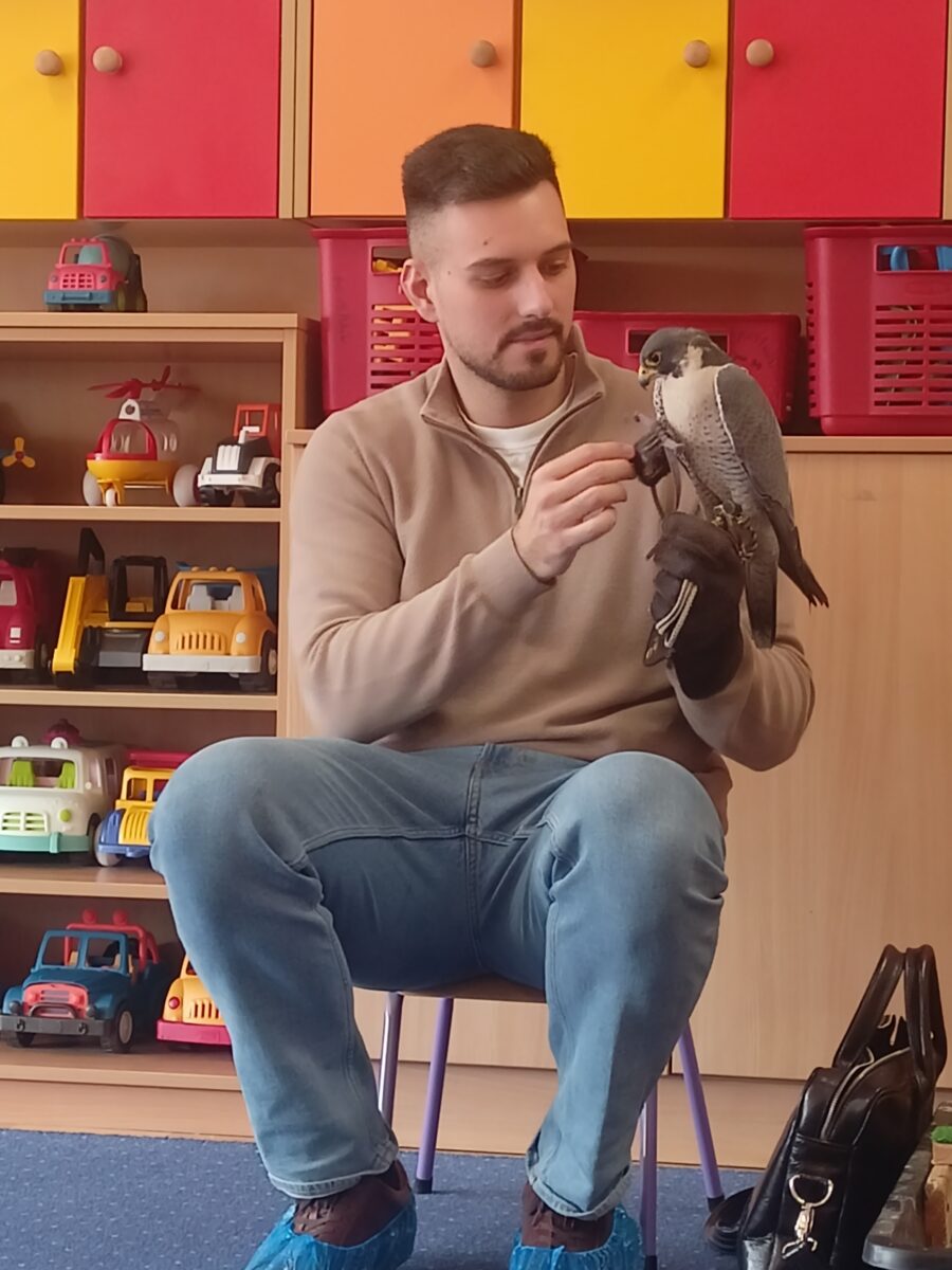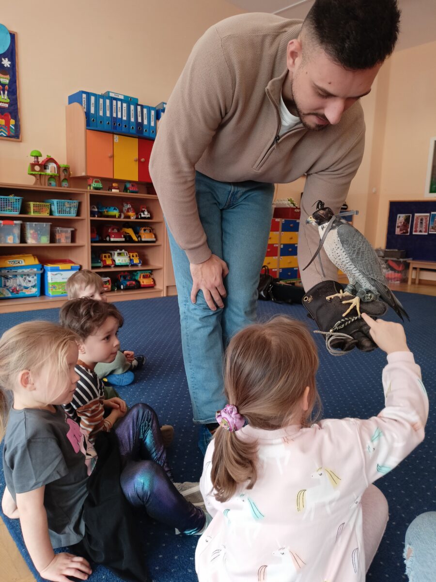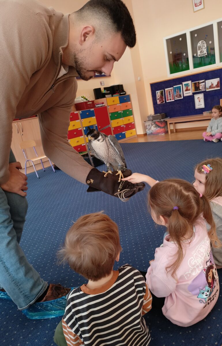 2 marca do naszego przedszkola zawitał gość specjalny, a mianowicie sokół wędrowny o imieniu Piorun- najszybsze zwierzę na świecie. Warsztaty dostarczyły dzieciom niezapomnianych emocji, a także były okazją do zdobycia unikalnej wiedzy na temat życia ptaków drapieżnych. Dzieci miały możliwość pogłaskania sokoła oraz zobaczenia akcesoriów takich jak kaptur czy rękawica.