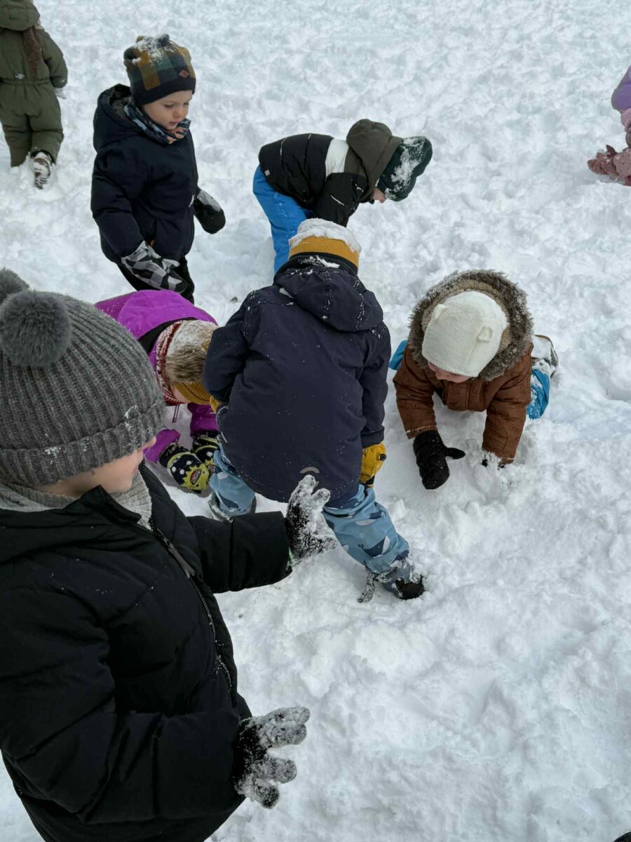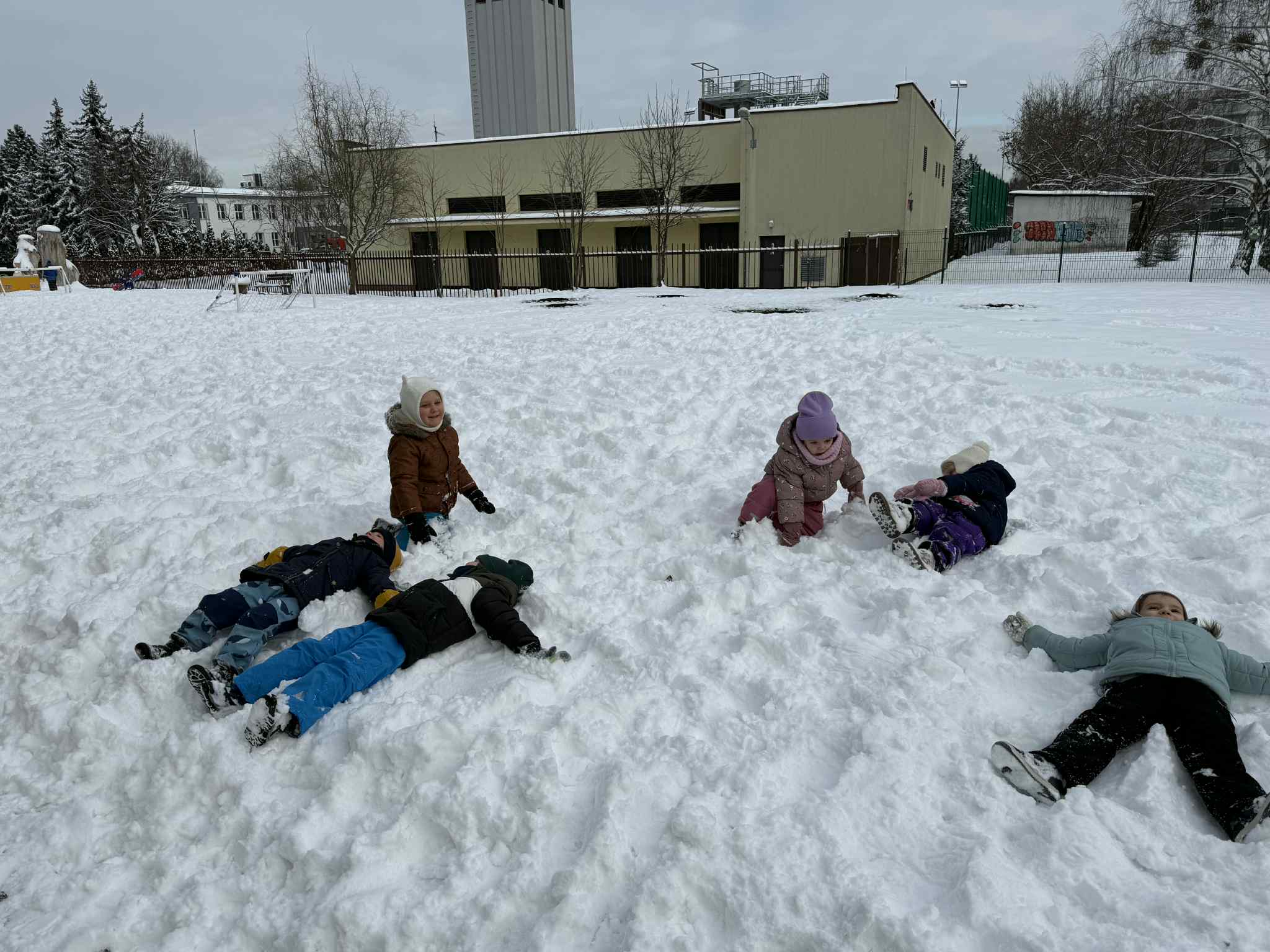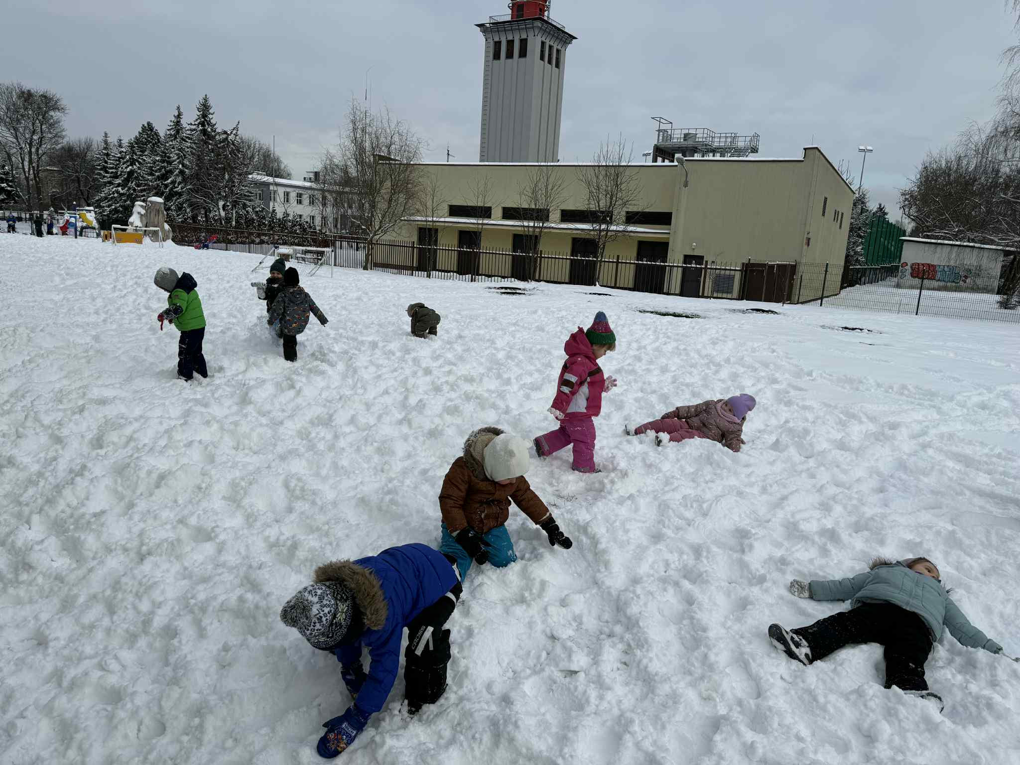 Korzystając z zimowej pogody, dzieci spędziły czas na wspólnych zabawach na śniegu. Aktywność na świeżym powietrzu sprzyjała rozwojowi sprawności ruchowej, koordynacji oraz równowagi. Słoneczka z radością uczestniczyły w zimowych zabawach, które dostarczyły im wielu pozytywnych emocji i sprzyjały integracji grupy.