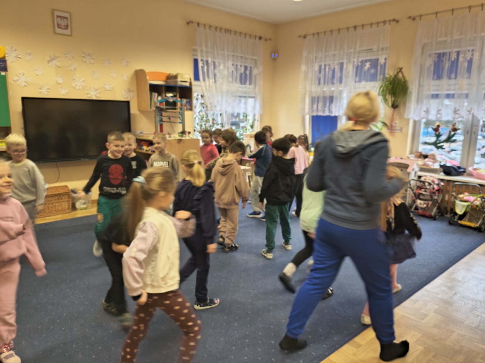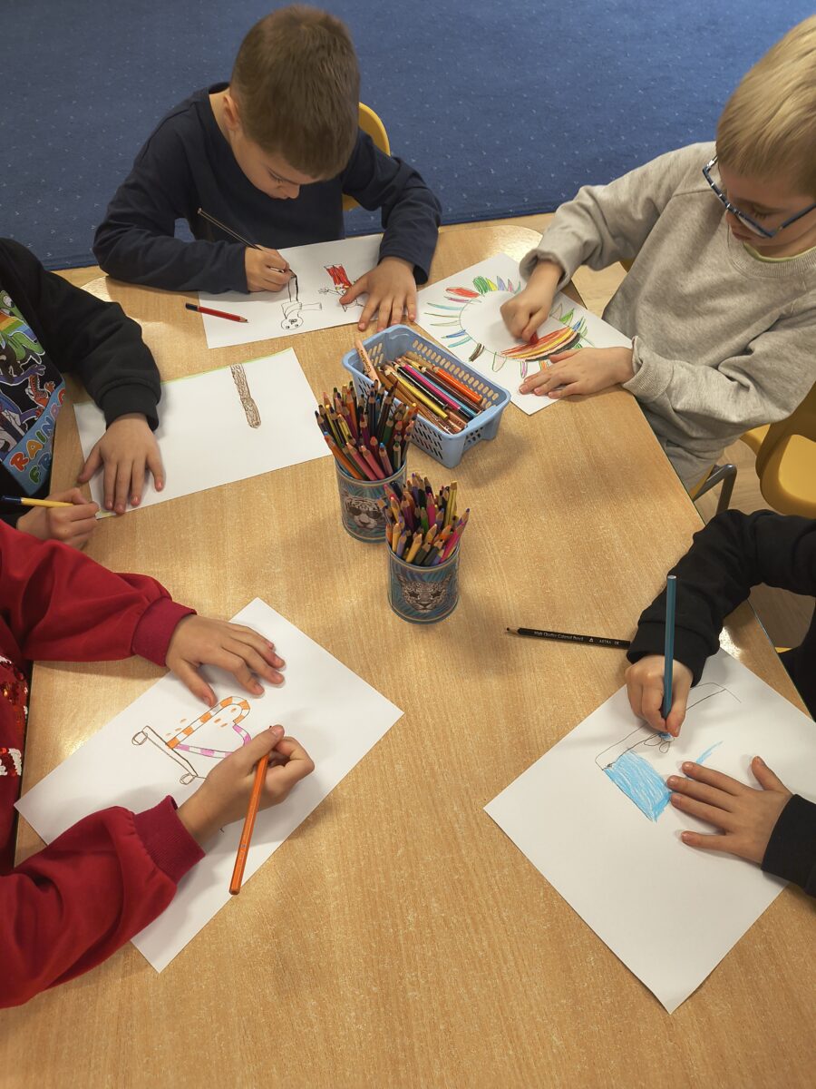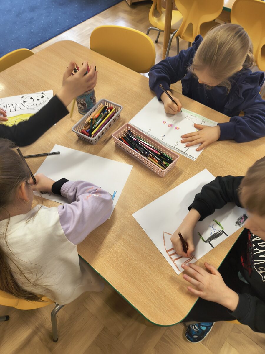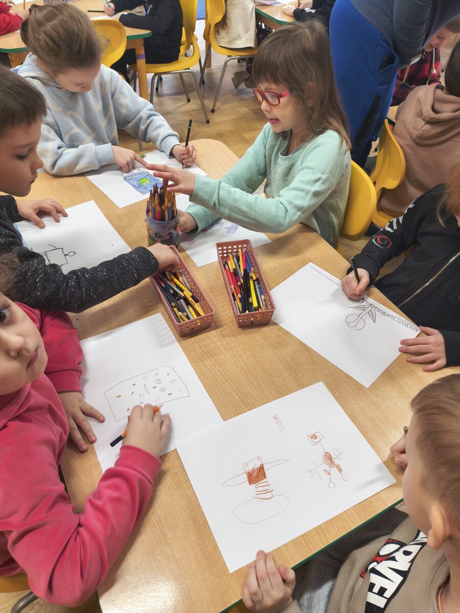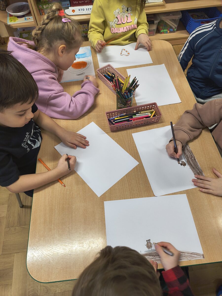Dzieci z grupy „Rybki” wzięły udział w niezwykłych warsztatach pt. „Laboratorium teatralne – sensoryczne przeszkadzacze”, które łączyły elementy teatru ruchu, improwizacji, zabawy sensorycznej oraz działań plastycznych. Rybki stały się prawdziwymi współtwórcami warsztatów – badały materiały, eksperymentowały z dźwiękami, tworzyły własne postacie oraz budowały świat wyobraźni. W trakcie spotkania odkrywały, jak ciało reaguje na różne bodźce, zamieniały „przeszkadzacze” w bohaterów teatralnych historii oraz tworzyły rysunki i krótkie scenki inspirowane powstającym spektaklem.