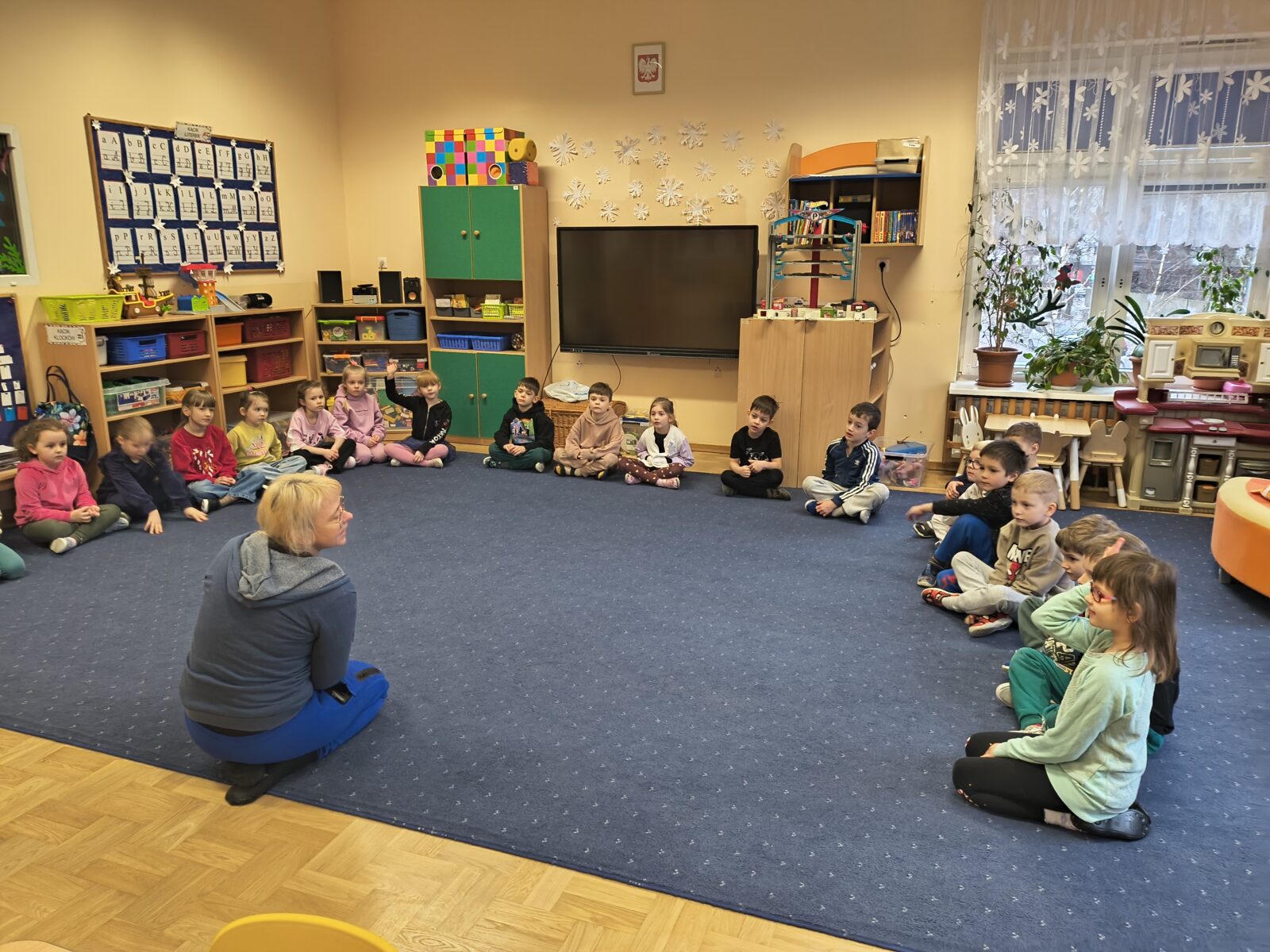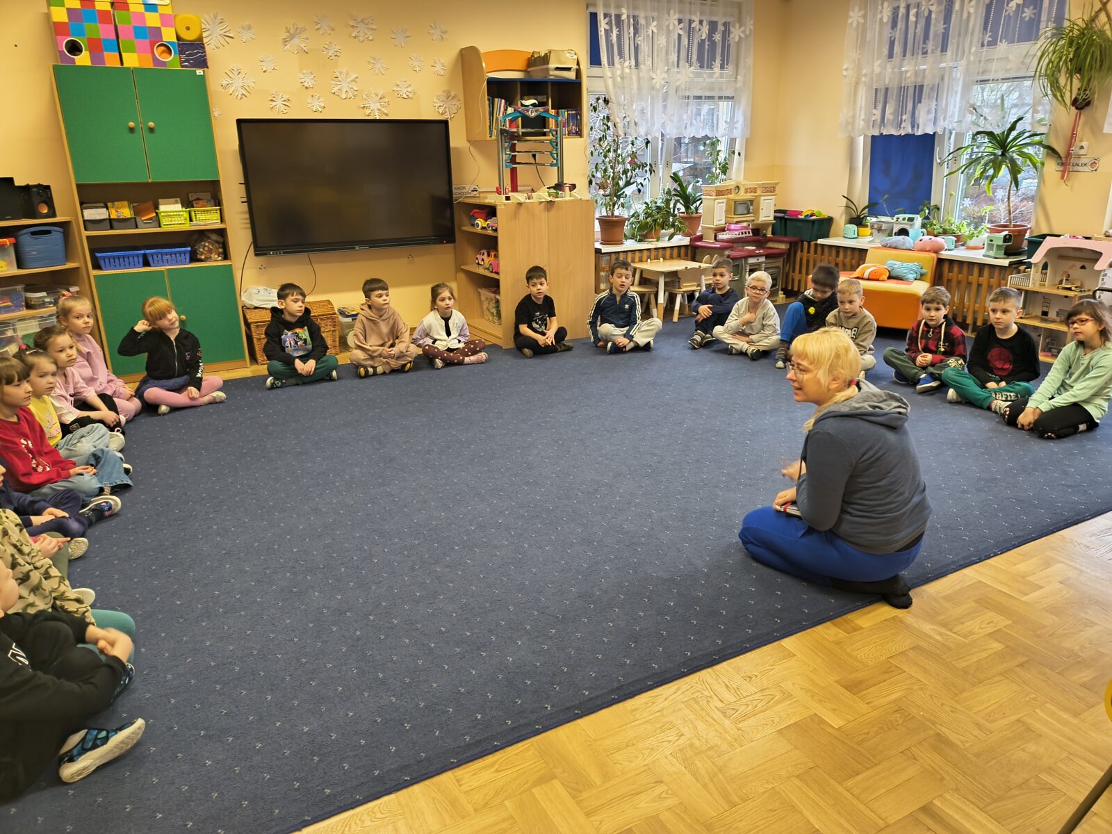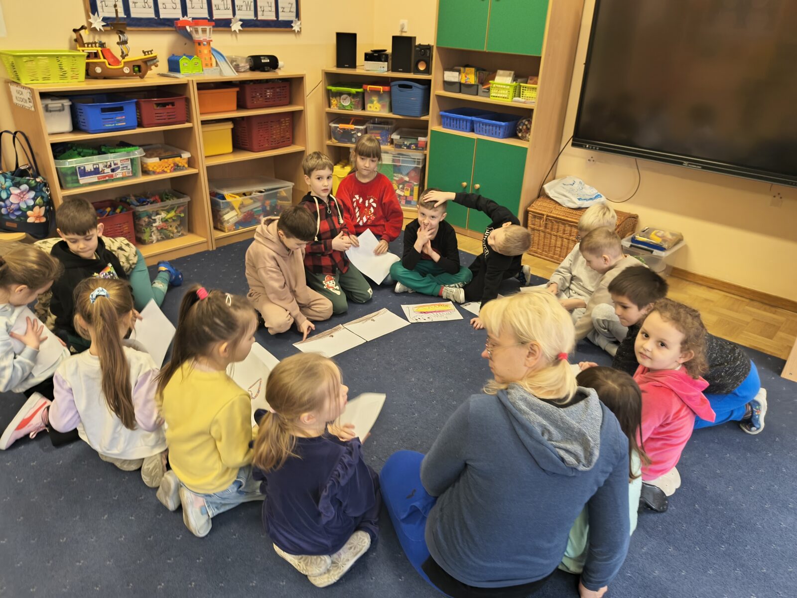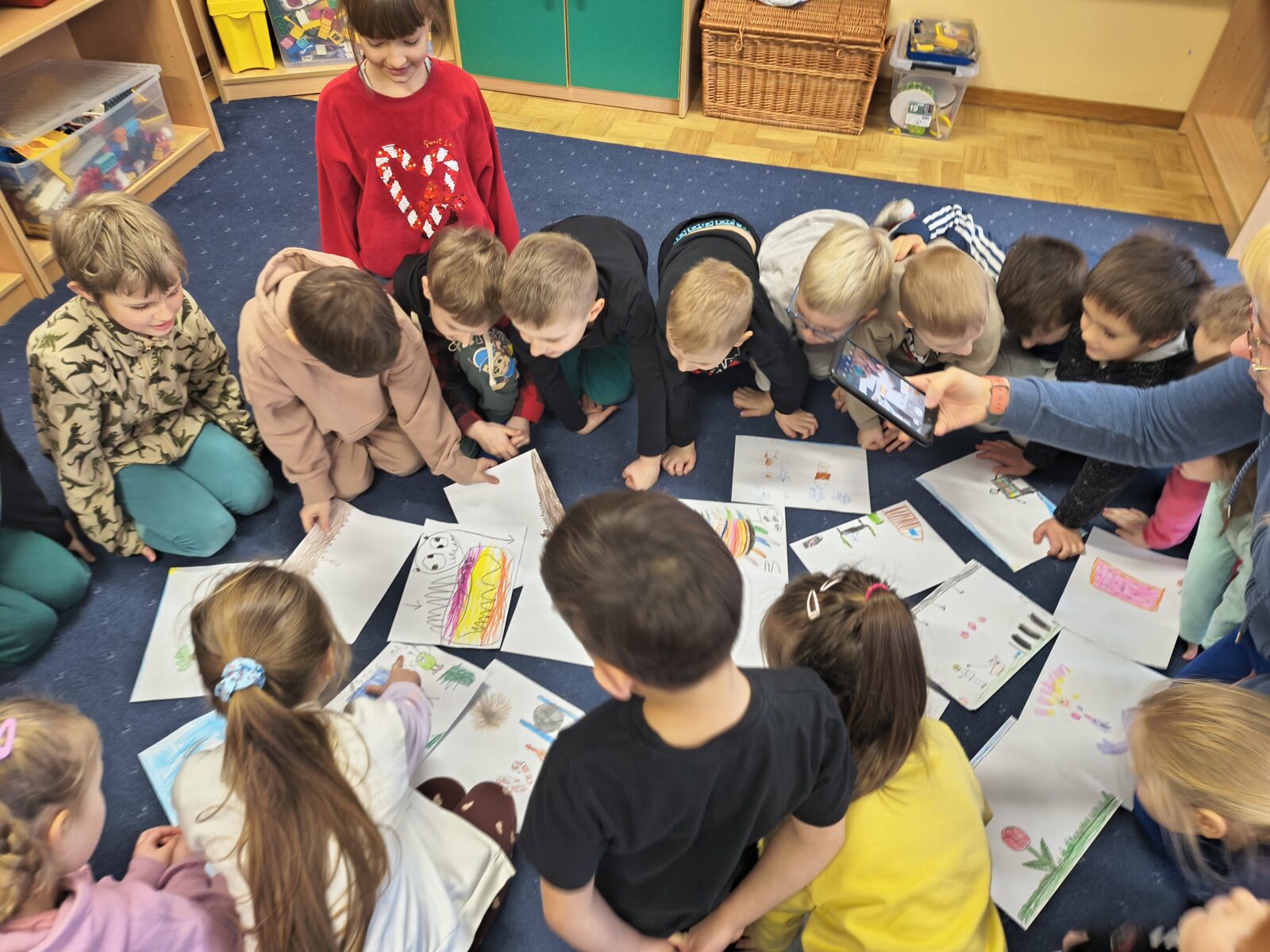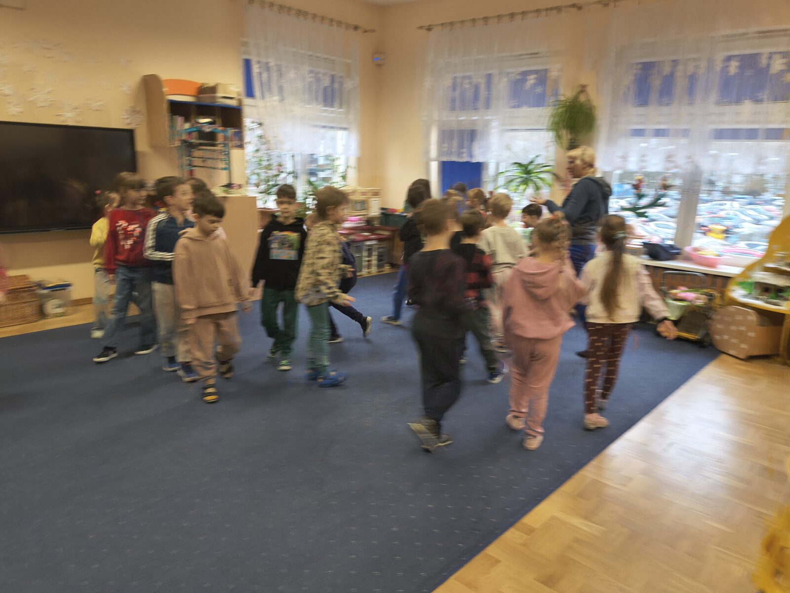 Dzieci z grupy „Rybki” wzięły udział w niezwykłych warsztatach pt. „Laboratorium teatralne – sensoryczne przeszkadzacze”, które łączyły elementy teatru ruchu, improwizacji, zabawy sensorycznej oraz działań plastycznych. Rybki stały się prawdziwymi współtwórcami warsztatów – badały materiały, eksperymentowały z dźwiękami, tworzyły własne postacie oraz budowały świat wyobraźni. W trakcie spotkania odkrywały, jak ciało reaguje na różne bodźce, zamieniały „przeszkadzacze” w bohaterów teatralnych historii oraz tworzyły rysunki i krótkie scenki inspirowane powstającym spektaklem.